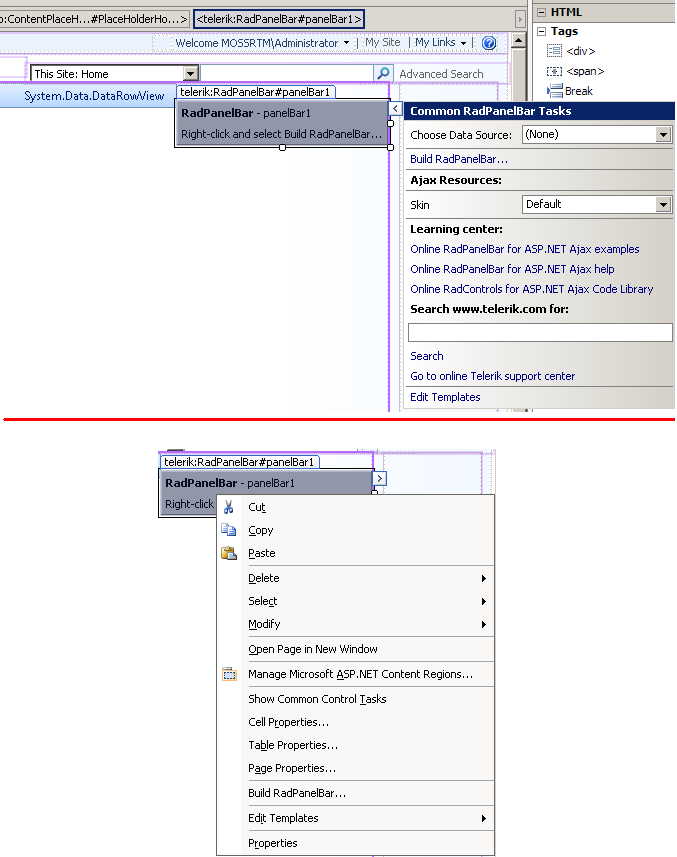 We are designing new master pages and swapping out the sharepoint navigation controls with the Telerik RadPanelBar nav. control. I am doing this is collaboration with a colleague in the UK. The problem arises in Designer, where he can see the common tasks panel for the control, which include options to configure Data source, Databindings, Ajax resources such as skin, and so on... whereas I do not see this panel at all. We are both using the same version of Designer accessing the same masterpage on the same server.