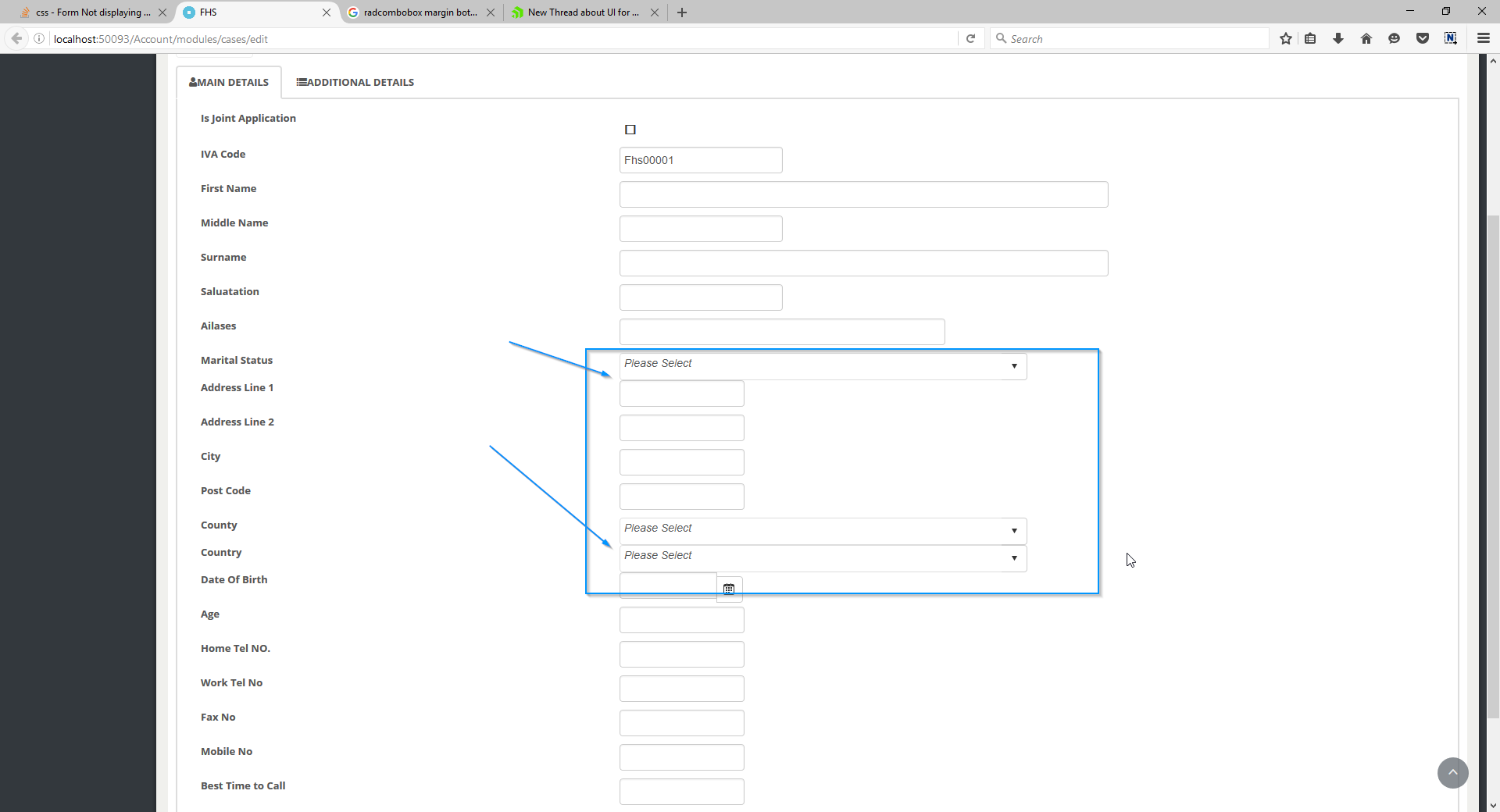 <form class="form-horizontal"> <fieldset> <div class="form-group"> <label class="col-md-4 control-label" for="textinput">Is Joint Application</label> <div class="col-md-8"> <label class="checkbox"> <telerik:RadCheckBox Skin="Bootstrap" ID="chkIsJointApplication" runat="server"></telerik:RadCheckBox> </label> </div> </div> <div class="form-group"> <label class="col-md-4 control-label" for="textinput">IVA Code</label> <div class="col-md-8"> <telerik:RadTextBox ID="txtIVACode" CssClass="form-control" Width="20%" Skin="Bootstrap" runat="server"></telerik:RadTextBox> </div> </div> <!-- Text input--> <div class="form-group"> <label class="col-md-4 control-label" for="textinput"> First Name</label> <div class="col-md-8"> <telerik:RadTextBox ID="txtFirstName" CssClass="form-control" Width="60%" Skin="Bootstrap" runat="server"></telerik:RadTextBox> </div> </div> <!-- Text input--> <div class="form-group"> <label class="col-md-4 control-label" for="textinput">Middle Name</label> <div class="col-md-8"> <telerik:RadTextBox ID="txtMiddle" CssClass="form-control" Width="20%" Skin="Bootstrap" runat="server"></telerik:RadTextBox> </div> </div> <!-- Text input--> <div class="form-group"> <label class="col-md-4 control-label" for="textinput"> Surname</label> <div class="col-md-8"> <telerik:RadTextBox ID="txtSurname" CssClass="form-control" Width="60%" Skin="Bootstrap" runat="server"></telerik:RadTextBox> </div> </div> <!-- Text input--> <div class="form-group"> <label class="col-md-4 control-label" for="textinput">Saluatation</label> <div class="col-md-8"> <telerik:RadTextBox ID="txtsaluatation" CssClass="form-control" Width="20%" Skin="Bootstrap" runat="server"></telerik:RadTextBox> </div> </div> <div class="form-group"> <label class="col-md-4 control-label" for="textinput">Ailases</label> <div class="col-md-8"> <telerik:RadTextBox ID="txtAilases" CssClass="form-control" Width="40%" Skin="Bootstrap" runat="server"></telerik:RadTextBox> </div> </div> <div class="form-group"> <label class="col-md-4 control-label" for="textinput">Marital Status</label> <div class="col-md-8"> <telerik:RadComboBox ID="rdMartialStatus" Width="50%" Skin="Bootstrap" EmptyMessage="Please Select" runat="server"></telerik:RadComboBox> </div> </div> <div class="form-group"> <label class="col-md-4 control-label" for="textinput">Address Line 1</label> <div class="col-md-8"> <telerik:RadTextBox ID="txtAddressLine1" CssClass="form-group-lg" Skin="Bootstrap" runat="server"></telerik:RadTextBox> </div> </div> <div class="form-group"> <label class="col-md-4 control-label" for="textinput">Address Line 2</label> <div class="col-md-8"> <telerik:RadTextBox ID="txtAddressLine2" CssClass="form-group-lg" Skin="Bootstrap" runat="server"></telerik:RadTextBox> </div> </div> <div class="form-group"> <label class="col-md-4 control-label" for="textinput">City</label> <div class="col-md-8"> <telerik:RadTextBox ID="txtCity" Skin="Bootstrap" runat="server"></telerik:RadTextBox> </div> </div> <div class="form-group"> <label class="col-md-4 control-label" for="textinput">Post Code</label> <div class="col-md-8"> <telerik:RadTextBox ID="txtPostCode" Skin="Bootstrap" runat="server"></telerik:RadTextBox> </div> </div> <div class="form-group"> <label class="col-md-4 control-label" for="textinput">County</label> <div class="col-md-8"> <telerik:RadComboBox ID="dpCounty" CssClass="form-group-lg" Width="50%" Skin="Bootstrap" EmptyMessage="Please Select" runat="server"></telerik:RadComboBox> </div> </div> <div class="form-group"> <label class="col-md-4 control-label" for="textinput">Country</label> <div class="col-md-8"> <telerik:RadComboBox ID="dpCountry" Width="50%" CssClass="form-group-lg" Skin="Bootstrap" EmptyMessage="Please Select" runat="server"></telerik:RadComboBox> </div> </div> <div class="form-group"> <label class="col-md-4 control-label" for="textinput">Date Of Birth</label> <div class="col-md-8"> <telerik:RadDatePicker ID="rdDob" Skin="Bootstrap" runat="server"></telerik:RadDatePicker> </div> </div> <div class="form-group"> <label class="col-md-4 control-label" for="textinput">Age</label> <div class="col-md-8"> <telerik:RadTextBox ID="txtAge" CssClass="form-group-lg" Skin="Bootstrap" runat="server"></telerik:RadTextBox> </div> </div> <div class="form-group"> <label class="col-md-4 control-label" for="textinput">Home Tel NO.</label> <div class="col-md-8"> <telerik:RadTextBox ID="txtHomeTelNo" CssClass="form-group-lg" Skin="Bootstrap" runat="server"></telerik:RadTextBox> </div> </div> <div class="form-group"> <label class="col-md-4 control-label" for="textinput">Work Tel No</label> <div class="col-md-8"> <telerik:RadTextBox ID="txtWorkTelNo" CssClass="form-group-lg" runat="server"></telerik:RadTextBox> </div> </div> <div class="form-group"> <label class="col-md-4 control-label" for="textinput">Fax No</label> <div class="col-md-8"> <telerik:RadTextBox ID="txtFaxNo" CssClass="form-group-lg" runat="server"></telerik:RadTextBox> </div> </div> <div class="form-group"> <label class="col-md-4 control-label" for="textinput">Mobile No</label> <div class="col-md-8"> <telerik:RadTextBox ID="txtMobileNo" CssClass="form-group-lg" runat="server"></telerik:RadTextBox> </div> </div> <div class="form-group"> <label class="col-md-4 control-label" for="textinput">Best Time to Call</label> <div class="col-md-8"> <telerik:RadTextBox ID="txtBestTimeToCall" CssClass="form-group-lg" runat="server"></telerik:RadTextBox> </div> </div> <div class="form-group"> <label class="col-md-4 control-label" for="textinput">Prefered Contact Method</label> <div class="col-md-8"> <telerik:RadComboBox ID="rdPreferedContactMethod" Width="50%" CssClass="form-group-lg" EmptyMessage="Please Select" runat="server"></telerik:RadComboBox> </div> </div> </fieldset> </div> <div class="tab-pane" id="two-normal"> <fieldset> <div class="form-group"> <label class="col-md-4 control-label" for="textinput">AML C</label> <div class="col-md-8"> <telerik:RadCheckBox ID="chkAmlCPerformed" CssClass="form-group-lg" r