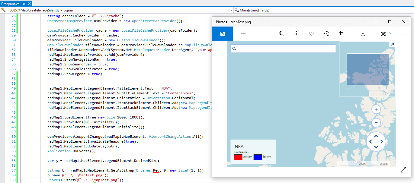 Note that RadMap uses a MapTileDownloader which internally uses a WebClient calling its DownloadDataAsync method. It seems that in a console application the WebClient.DownloadDataCompleted event is not fired which is used in the MapTileDownloader. That is why the image that is created from the map is blank. The following StackOverflow thread faces a similar case: https://stackoverflow.com/questions/2792608/webclient-downloadstringcompleted-never-fired-in-console-application