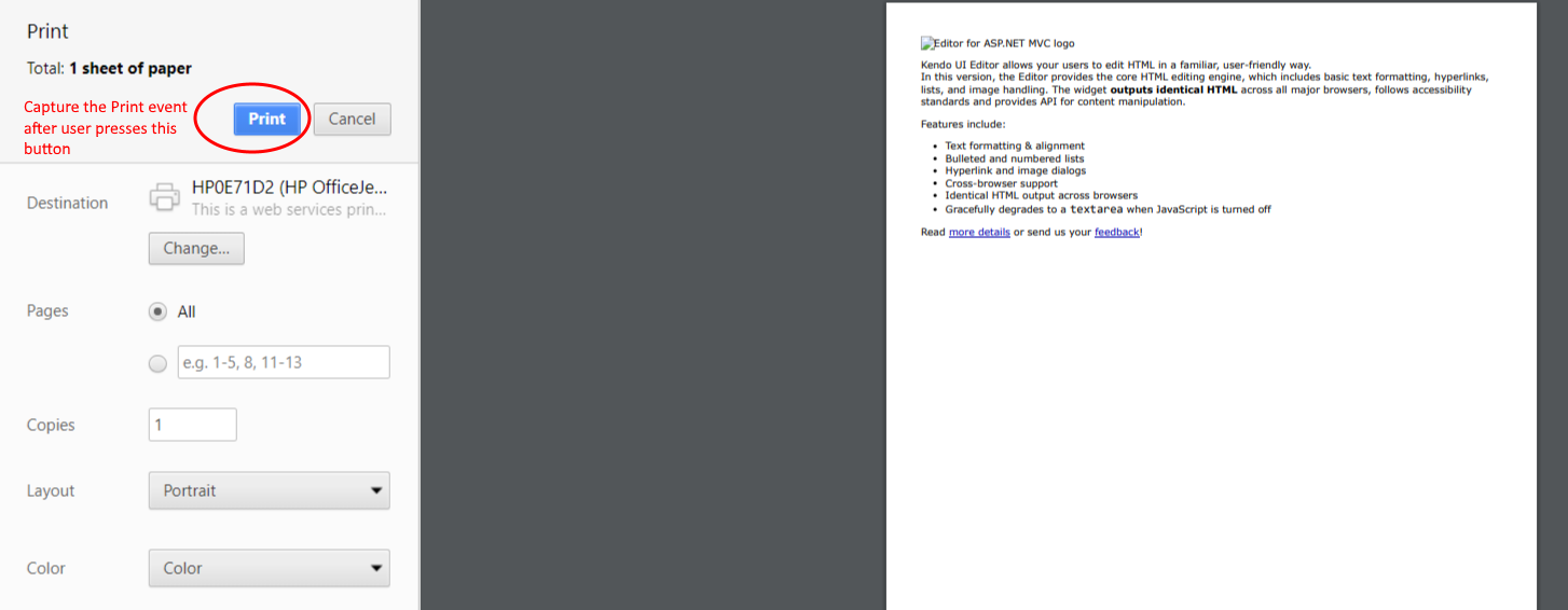 Im using the Kendo UI Editor and I'd like to be able to capture the print event - not the Print Execute command but the actual printing of the document (see attached image).
