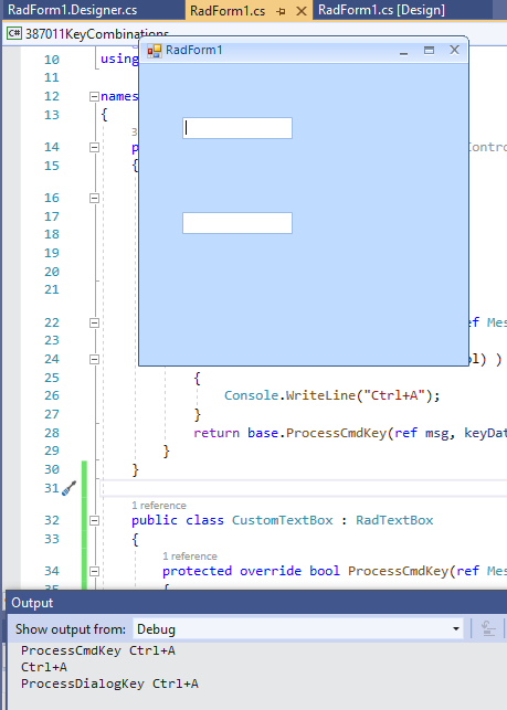 I have created a derivative of RadTextBox on my end and override both, the ProcessDialogKey and ProcessCmdKey methods. Both of them seems to detect pressing Ctrl+A: