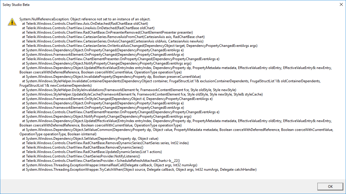 I have added a scrollviewer to the vertical axis in the telerik:RadCartesianChart But while closing the view have this exception ( null Ref ChartView.Axis.OnDetached(RadChartBase old chart). Cloud you please help to fix this bug?.