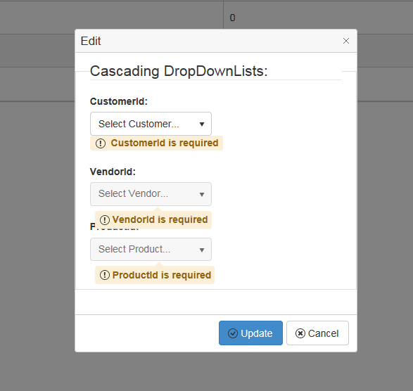 I have a grid with a pop-up edit form, with a cascading dropdown list. It works fine except that when choosing to add a new record, the form opens and the dropdown list shows the validation error message before the user has done anything.