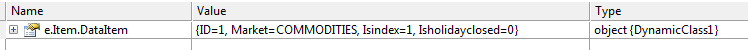 <telerik:OpenAccessLinqDataSource ID="OAL_Stock_Topic" runat="server" ContextTypeName="Flow.Financials_ST2" EntityTypeName="" ResourceSetName="Stock_topics" Select="new (ID, Market, IsIndex, IsHolidayClosed)" Where="Enabled == @Enabled"> <WhereParameters> <asp:Parameter DefaultValue="1" Name="Enabled" Type="Int16" /> </WhereParameters></telerik:OpenAccessLinqDataSource>c# for DataBound Event