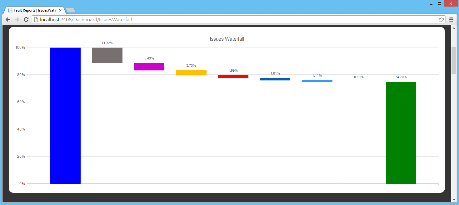 @(Html.Kendo().Chart() .Name("chart") .Theme("flat") .Title("Issues Waterfall") .DataSource(ds => ds .ServerOperation(false) ) .Series(series => { series.Column(new double[] { 100 }).Name("Total").Color("Blue").Stack("Total"); foreach (var resp in Model.listResponsibleDowntime) { series.Column(new double?[] { resp.percent_pad }).Name(resp.resp_name).Color("White").Opacity(0).Labels(false).Tooltip(false).Stack(resp.resp_name); series.Column(new double?[] { resp.percent_downtime }).Name(resp.resp_name).Color(resp.resp_color).Labels(lables => lables.Format("{0:n2}%").Visible(true).Position(ChartBarLabelsPosition.OutsideEnd)).Stack(resp.resp_name); } series.Column(new double?[] { Model.oee }).Name("Actual").Color("Green").Stack("Actual").Labels(lables => lables.Format("{0:n2}%").Visible(true).Position(ChartBarLabelsPosition.OutsideEnd)); }) .CategoryAxis(axis => axis .MajorGridLines(lines => lines.Visible(false)) .Labels(model => model .Rotation(0) .Visible(true) ) //.Categories(Model.listCategories) ) .Legend(legend => legend .Position(ChartLegendPosition.Top) .Margin(20, 50, 20, 50) .Visible(false) ) .ValueAxis(axis => axis .Numeric() .Min(0) .Max(100) .Labels(labels => labels.Format("{0:n0}%")) ) .Tooltip(tooltip => tooltip .Visible(true) .Template("#= series.name #: #= kendo.format('{0:n2}', value) #") ))