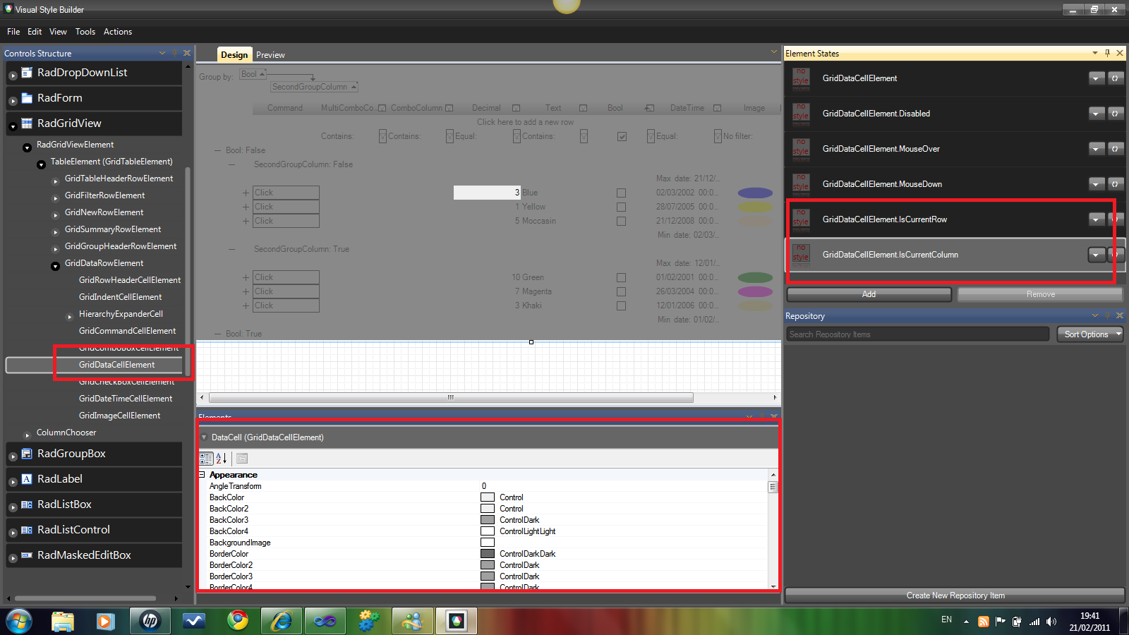 private void radGridView1_CellFormatting(object sender, Telerik.WinControls.UI.CellFormattingEventArgs e) { if (e.CellElement.IsCurrent) { e.CellElement.BorderBoxStyle = Telerik.WinControls.BorderBoxStyle.FourBorders; e.CellElement.BorderTopColor = Color.FromArgb(255, 190, 106); e.CellElement.BorderTopShadowColor = Color.FromArgb(255, 245, 162); e.CellElement.BorderBottomColor = Color.FromArgb(255, 190, 106); e.CellElement.BorderBottomShadowColor = Color.FromArgb(255, 245, 162); } else { e.CellElement.ResetValue(LightVisualElement.BorderBoxStyleProperty, Telerik.WinControls.ValueResetFlags.Local); e.CellElement.ResetValue(LightVisualElement.BorderTopColorProperty, Telerik.WinControls.ValueResetFlags.Local); e.CellElement.ResetValue(LightVisualElement.BorderTopShadowColorProperty, Telerik.WinControls.ValueResetFlags.Local); e.CellElement.ResetValue(LightVisualElement.BorderBottomColorProperty, Telerik.WinControls.ValueResetFlags.Local); e.CellElement.ResetValue(LightVisualElement.BorderBottomShadowColorProperty, Telerik.WinControls.ValueResetFlags.Local); }Hope that helps but let me know if you have further questions