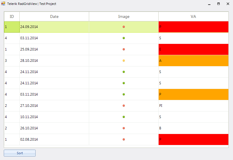 I'm using CellFormatting event to color some cells in my RadGridView. On Form_Load it works fine (see first image). But when I sort the RadGridView it messes the whole thing up (see second image). You can see my code here: