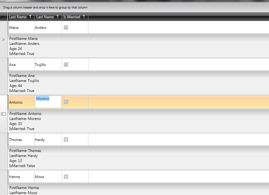 Let’s stay with the last example. I want the textbox control to fill the whole cell’s space, so when the cell is being resized (for any reason) the textbox control should resize with it. For example, I have made the template text-box style column accept return (AcceptsReturn=”True”) so I’ll be able to make its height change (by pressing the return key when editing the text box).