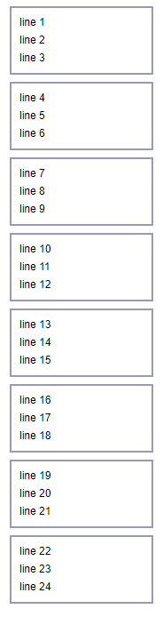 var vLines = [5, 90, 175, 260, 345, 430, 515, 600];...$.each(vLines, function (index, value) { var group = getBox("line " + count++, "line " + count++, "line " + count++); group.transform(geom.transform().translate(10, value)); surface.draw(group);});....function getBox(text1, text2, text3) { var lineColor = "#9999b6"; var lineWidth = 2; var fontNormal = "12px Arial"; var group = new draw.Group(); var rect = new geom.Rect([0, 0], [160, 75]); var path = draw.Path.fromRect(rect, { stroke: { color: lineColor, width: lineWidth } }); group.append(path); if (text1) { group.append(new draw.Text(text1, new geom.Point(10, 10), { font: fontNormal })); } if (text2) { group.append(new draw.Text(text2, new geom.Point(10, 30), { font: fontNormal })); } if (text3) { group.append(new draw.Text(text3, new geom.Point(10, 50), { font: fontNormal })); } return group;}