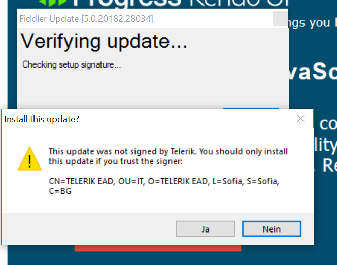 This is expected behavior and there is nothing to worry about. Here is official blog mentioning it. Go ahead and hit Yes/Ja and keep enjoying Fiddler.