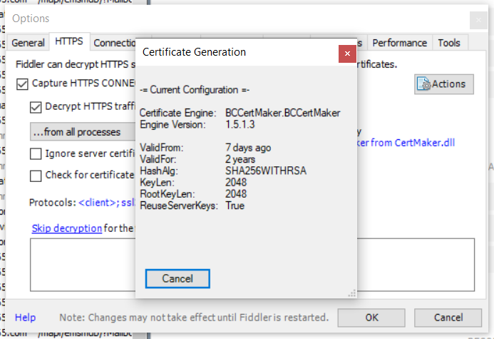 Lastly, some browsers are having issues when the Fiddler root certificate is not in their Trusted Authorities store. Not sure which browses are causing the issue, but you could also check the OS certificate settings and check if the issue will be resolved by adding the Fiddler certificate in the authorities store.