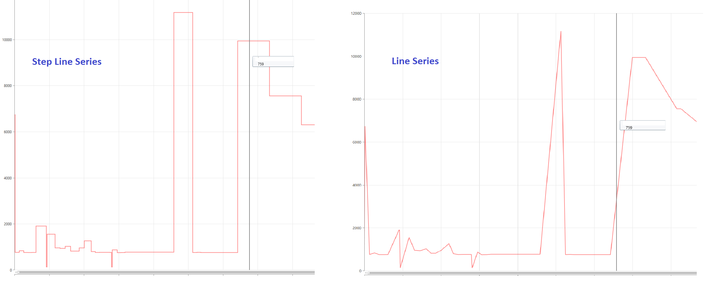 I am bit puzzled how to shown visualization is achieved. It seems that the chart has two LinearAxes, but it uses StepLineSeries, which is not supported, so I will guess I am missing something. Can you send some runnable code snippets showing your setup and also some sample data to check this? Maybe ~10 data points. Also, you can open a new support ticket and attach a runnable project there.