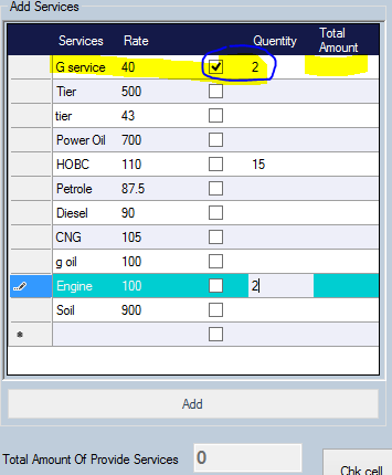 Here i have a gridview containg Services, Rate, ChekBox(if checkBox is Checked it means Service is used Otherwise Services Not used) , Quantity , Amount(Rate * Quantity)