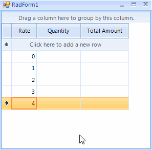 GridViewDecimalColumn rateColumn = new GridViewDecimalColumn("Rate"); radGridView1.MasterTemplate.Columns.Add(rateColumn);GridViewDecimalColumn quantity = new GridViewDecimalColumn("Quantity"); radGridView1.MasterTemplate.Columns.Add(quantity);GridViewDecimalColumn amount = new GridViewDecimalColumn("Total Amount"); amount.Expression = "Rate * Quantity";radGridView1.MasterTemplate.Columns.Add(amount);for (int i = 0; i < 5; i++){ this.radGridView1.Rows.Add(i);}I hope this information helps. If you have any additional questions, please let me know.