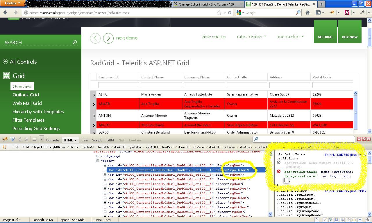 .RadGrid .rgAltRow {background-color : Red !important;}// OR .RadGrid_YOURSKINNAME .rgAltRow {background-color : Red !important;}Thanks,