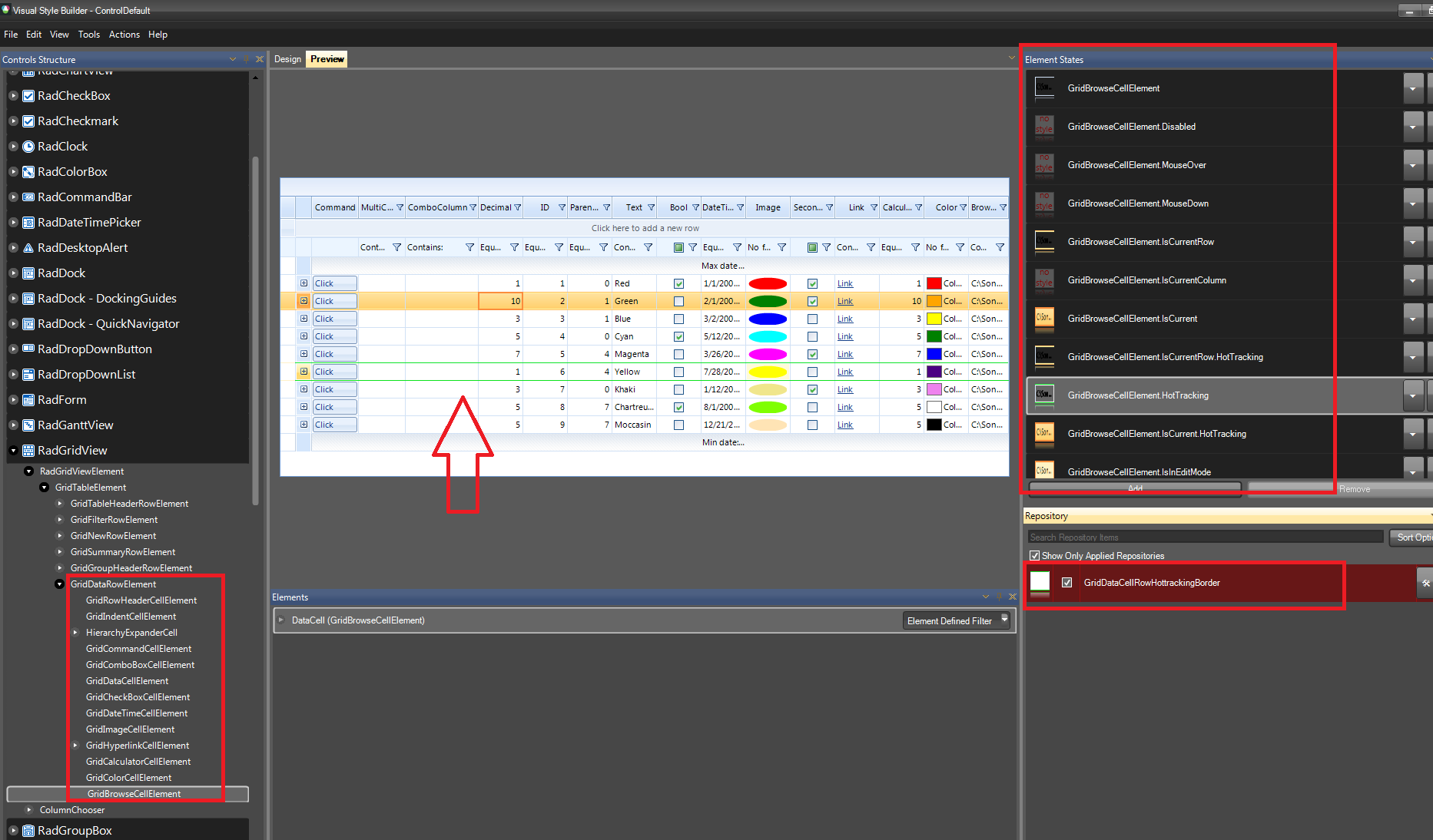 In order to change the cell and row border for IsSelected, IsCurrent and HotTracking states, it is necessary to customize the theme by modifying the specific grid CellElement's and GridDataRowElement's repository items for the specific element states via our Visual Style Builder.
