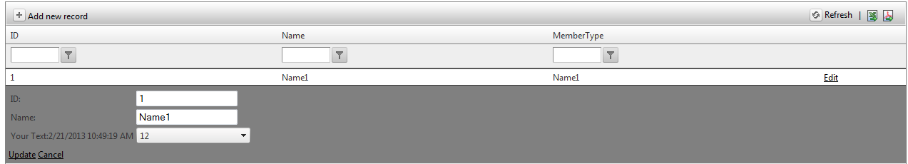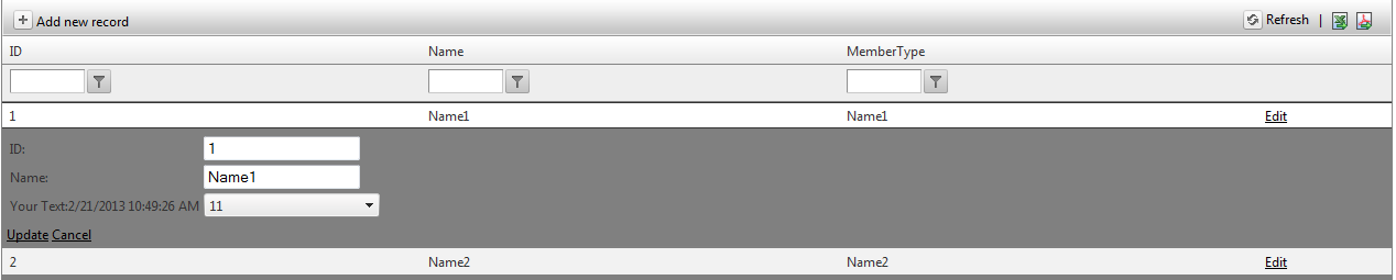 <telerik:RadGrid ID="RadGrid1" runat="server" AutoGenerateColumns="False" OnNeedDataSource="RadGrid1_NeedDataSource" AllowPaging="true" AllowFilteringByColumn="true" ShowFooter="true" AllowMultiRowSelection="true" AllowMultiRowEdit="true" PageSize="10" > <MasterTableView CommandItemDisplay="Top" EditMode="EditForms" Name="Parent" DataKeyNames="ID" ClientDataKeyNames="ID"> <CommandItemSettings ShowExportToExcelButton="true" ShowExportToPdfButton="true" /> <Columns> <telerik:GridBoundColumn DataField="ID" UniqueName="ID" HeaderText="ID"> </telerik:GridBoundColumn> <telerik:GridBoundColumn DataField="Name" UniqueName="Name" HeaderText="Name"> </telerik:GridBoundColumn> <telerik:GridTemplateColumn HeaderText="MemberType" UniqueName="MemberType"> <ItemTemplate> <asp:Label ID="lblMemberType" runat="server" Text='<%# Eval("Name") %>'></asp:Label> </ItemTemplate> <EditItemTemplate> <telerik:RadComboBox runat="server" ID="cmbMemberTypes" OnSelectedIndexChanged="cmbMemberTypes_SelectedIndexChanged" AutoPostBack="true"> <Items> <telerik:RadComboBoxItem Text="11" Value="11" /> <telerik:RadComboBoxItem Text="12" Value="12" /> </Items> </telerik:RadComboBox> </EditItemTemplate> </telerik:GridTemplateColumn> <telerik:GridEditCommandColumn> </telerik:GridEditCommandColumn> </Columns> </MasterTableView> <PagerStyle AlwaysVisible="True" /> </telerik:RadGrid> protected void cmbMemberTypes_SelectedIndexChanged(object sender, RadComboBoxSelectedIndexChangedEventArgs e) { TableCell cell = (sender as RadComboBox).Parent.Parent.Controls[0] as TableCell; cell.Text = cell.Text.Substring(0, cell.Text.IndexOf(">") + 1) + "Your Text:" +DateTime.Now.ToString() + "</label>"; }protected void RadGrid1_NeedDataSource(object sender, GridNeedDataSourceEventArgs e) { dynamic data = new[] { new { ID = 1, Name ="Name1",path="1.jpg",Customedate=DateTime.Now,ReceivedDate=DateTime.Now.AddDays(1)}, new { ID = 2, Name = "Name2",path="2.jpg",Customedate=DateTime.Now,ReceivedDate=DateTime.Now.AddDays(2)}, new { ID = 3, Name = "Name3",path="3.jpg",Customedate=DateTime.Now,ReceivedDate=DateTime.Now.AddDays(3)}, new { ID = 4, Name = "Name4",path="2.jpg",Customedate=DateTime.Now,ReceivedDate=DateTime.Now.AddDays(4)}, new { ID = 5, Name = "Name5",path="3.jpg",Customedate=DateTime.Now,ReceivedDate=DateTime.Now.AddDays(5)}, new { ID = 6, Name ="Name1",path="1.jpg",Customedate=DateTime.Now,ReceivedDate=DateTime.Now.AddDays(6)}, new { ID = 7, Name = "Name2",path="2.jpg",Customedate=DateTime.Now,ReceivedDate=DateTime.Now.AddDays(7)}, new { ID = 8, Name = "Name3",path="3.jpg",Customedate=DateTime.Now,ReceivedDate=DateTime.Now.AddDays(8)}, new { ID = 9, Name = "Name4",path="2.jpg",Customedate=DateTime.Now,ReceivedDate=DateTime.Now.AddDays(9)}, new { ID = 10, Name = "Name5",path="3.jpg",Customedate=DateTime.Now,ReceivedDate=DateTime.Now.AddDays(10)}, new { ID = 11, Name ="Name1",path="1.jpg",Customedate=DateTime.Now,ReceivedDate=DateTime.Now.AddDays(11)}, new { ID = 12, Name = "Name2",path="2.jpg",Customedate=DateTime.Now,ReceivedDate=DateTime.Now.AddDays(12)}, new { ID = 13, Name = "Name3",path="3.jpg",Customedate=DateTime.Now,ReceivedDate=DateTime.Now.AddDays(13)}, new { ID = 14, Name = "Name4",path="2.jpg",Customedate=DateTime.Now,ReceivedDate=DateTime.Now.AddDays(14)}, new { ID = 15, Name = "Name5",path="3.jpg",Customedate=DateTime.Now,ReceivedDate=DateTime.Now.AddDays(150)} }; RadGrid1.DataSource = data; }Note : You can see that in screenshot no 3 and 4 only in edit label Membertype changed with Yourtext.