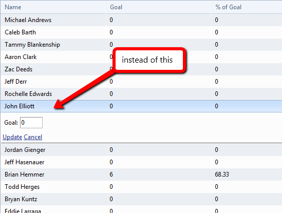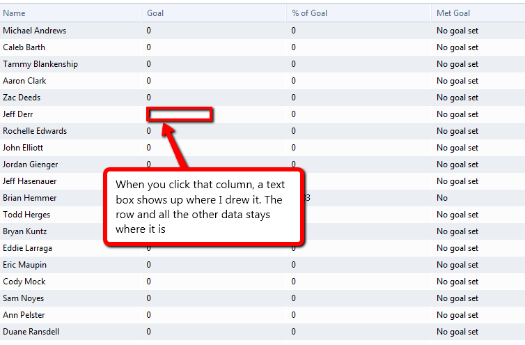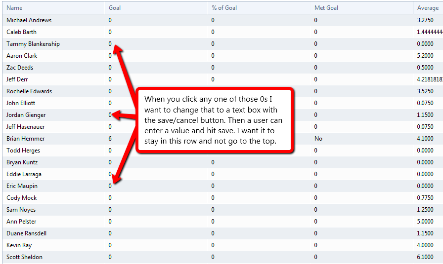 <telerik:RadGrid ID="RadGrid1" runat="server" GridLines="None" AllowPaging="True" AllowSorting="True" AutoGenerateColumns="false" PageSize="50" Skin="Windows7"> <ClientSettings> <ClientEvents OnRowDblClick="RowDblClick" /> <ClientEvents OnRowClick="RowClick" /> </ClientSettings> <MasterTableView DataKeyNames="memberId" AutoGenerateColumns="false" EditMode="InPlace" > <RowIndicatorColumn> <HeaderStyle Width="20px"></HeaderStyle> </RowIndicatorColumn> <ExpandCollapseColumn> <HeaderStyle Width="20px"></HeaderStyle> </ExpandCollapseColumn> <Columns> <telerik:GridBoundColumn DataField="name" HeaderText="Name" SortExpression="name" UniqueName="name" HeaderStyle-Width="80px" ReadOnly="true"> </telerik:GridBoundColumn> <telerik:GridTemplateColumn DataField="goalhours" HeaderText="Goal" SortExpression="goalHours" UniqueName="goalHours" HeaderStyle-Width="80px" > <ItemTemplate> <asp:Label ID="goalOutput" runat="server" Text='<%# Bind("goalHours") %>'></asp:Label> </ItemTemplate> <EditItemTemplate> <telerik:RadTextBox ID="goalHoursInput" Runat="server" Value='<%# Eval("goalHours") %>' Width="40px"> </telerik:RadTextBox> <asp:CompareValidator ID="hoursValidate" runat="server" ControlToValidate="goalHoursInput" ErrorMessage="Please enter a number" Operator="DataTypeCheck" Type="Double" Display="Dynamic"></asp:CompareValidator> </EditItemTemplate> </telerik:GridTemplateColumn> <telerik:GridBoundColumn DataField="percent" HeaderText="% of Goal" SortExpression="percent" UniqueName="percent" HeaderStyle-Width="80px" ReadOnly="true"> </telerik:GridBoundColumn> <telerik:GridBoundColumn DataField="metGoal" HeaderText="Met Goal" SortExpression="metGoal" UniqueName="metGoal" HeaderStyle-Width="80px" ReadOnly="true"> </telerik:GridBoundColumn> <telerik:GridBoundColumn DataField="averageHours" HeaderText="Average" SortExpression="averageHours" UniqueName="averageHours" HeaderStyle-Width="80px" ReadOnly="true"> </telerik:GridBoundColumn> </Columns> </MasterTableView> </telerik:RadGrid>0