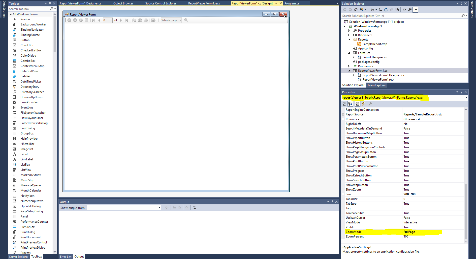 The default layout view can be easily changed from 100% to olePage from the Properties pane of the report viewer. You only have to set the ZoomModeto FullPage.