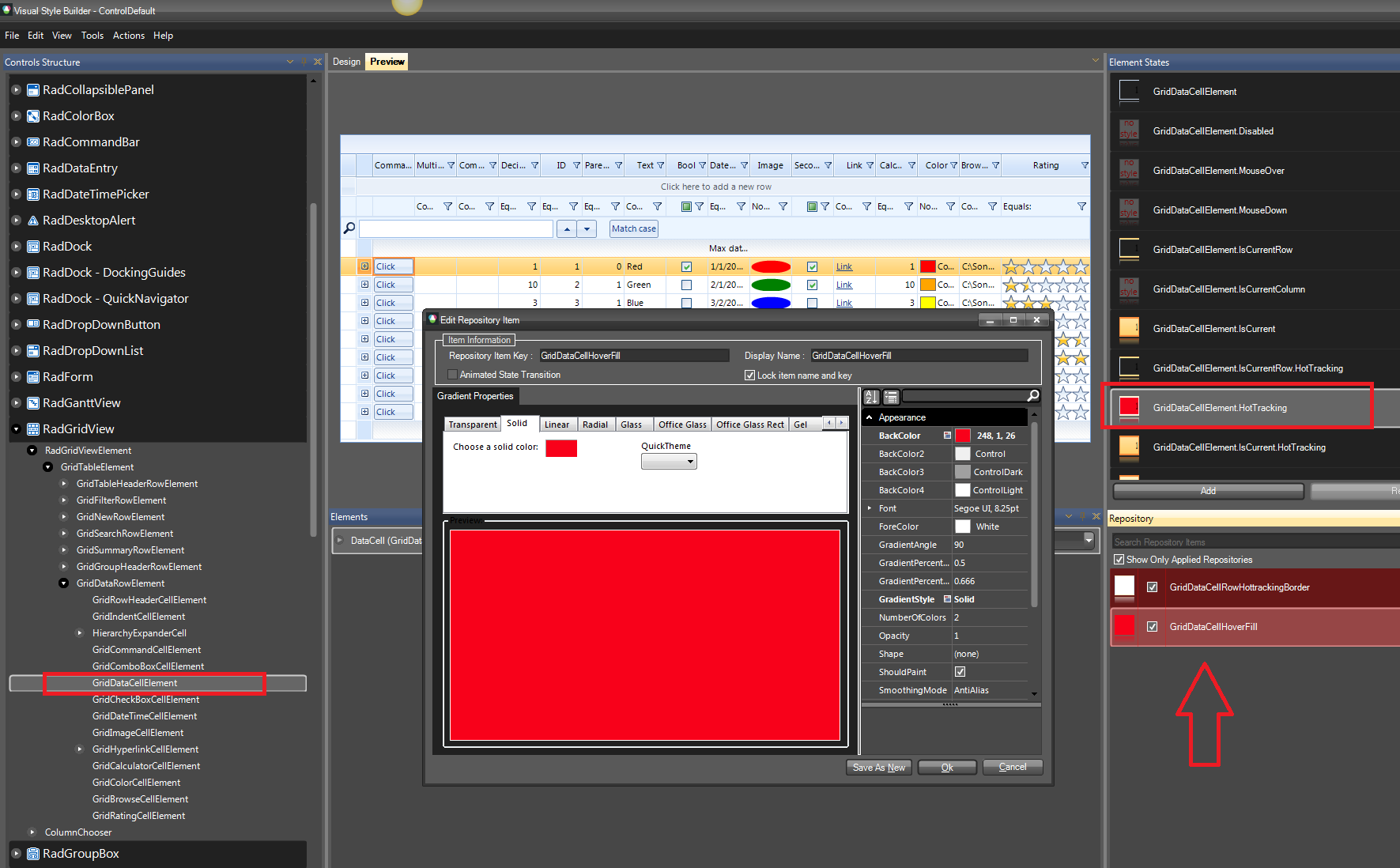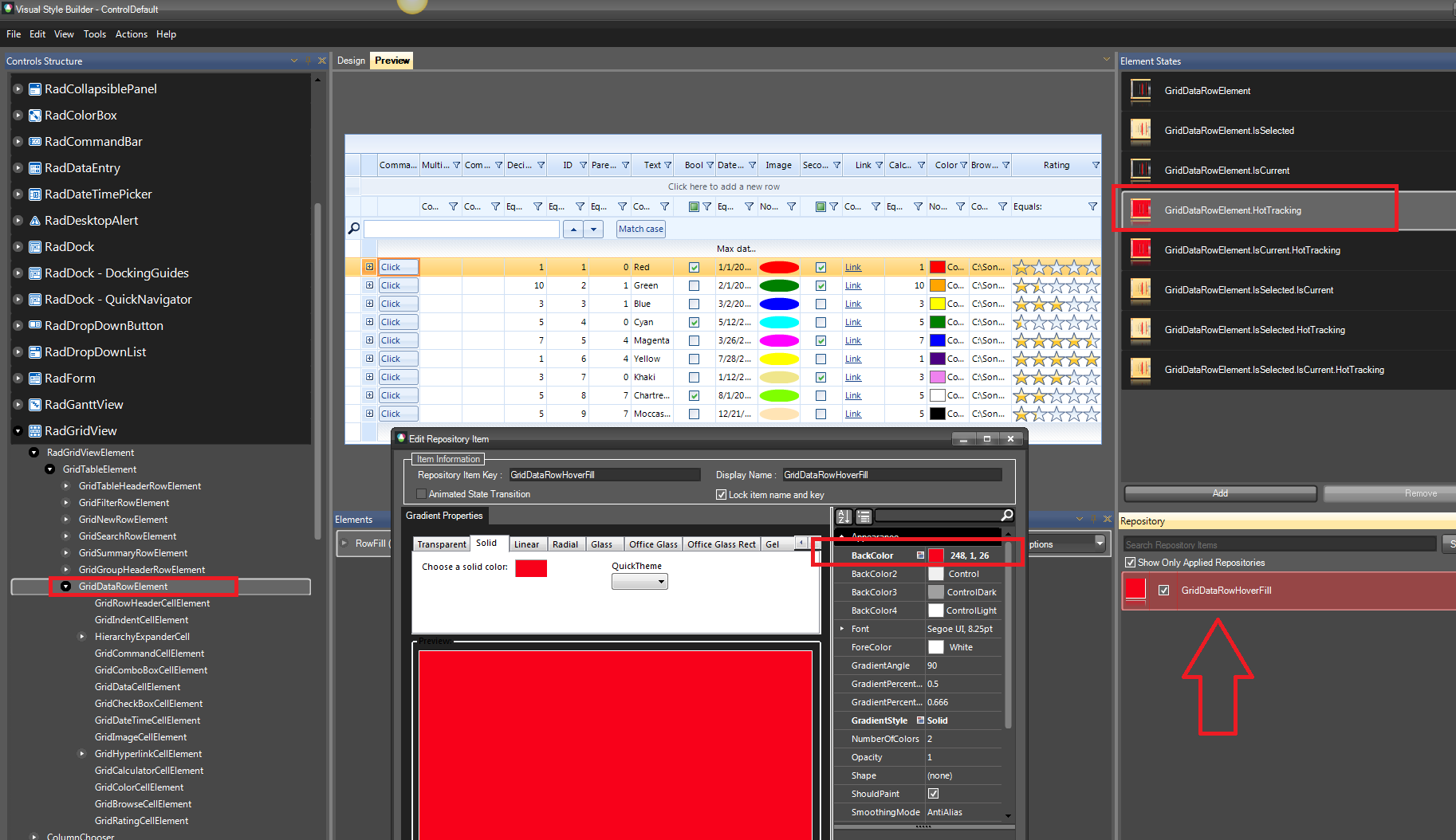 Thanks for replying.But the solution dint work for me. I have copied the code snippet. ResponeData is a pannel which contains radgrid. I need to change the Backcolor of the radgrid