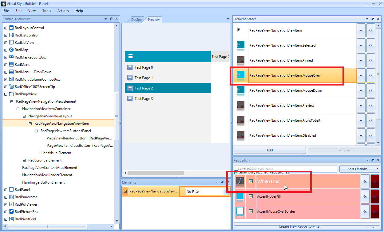 I have some questions on RadPageView Winforms UI. How can I change the color of hamburger button and RadPageViewPage when I hover my mouse on to it ? Let say, I want to change it to #3373ba hex color.
