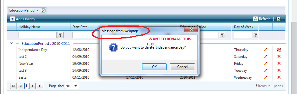 Also, I tried using the code you posted above. But the problem is in Delete Dialog box, I need to show custom message based on the item user wish to delete.