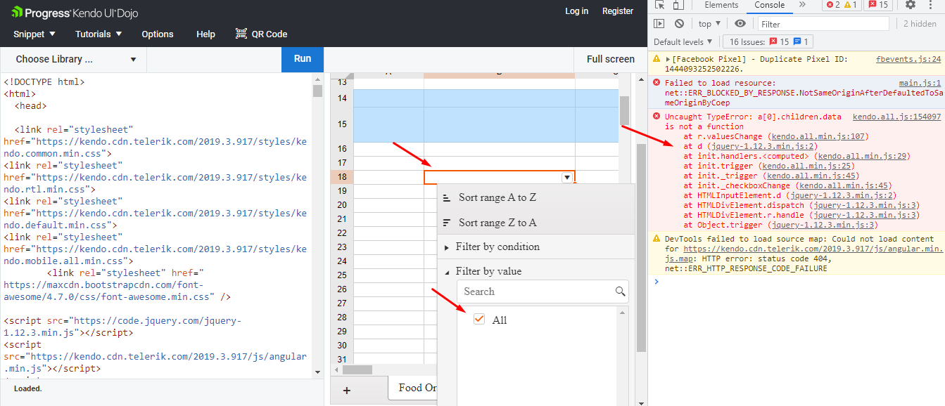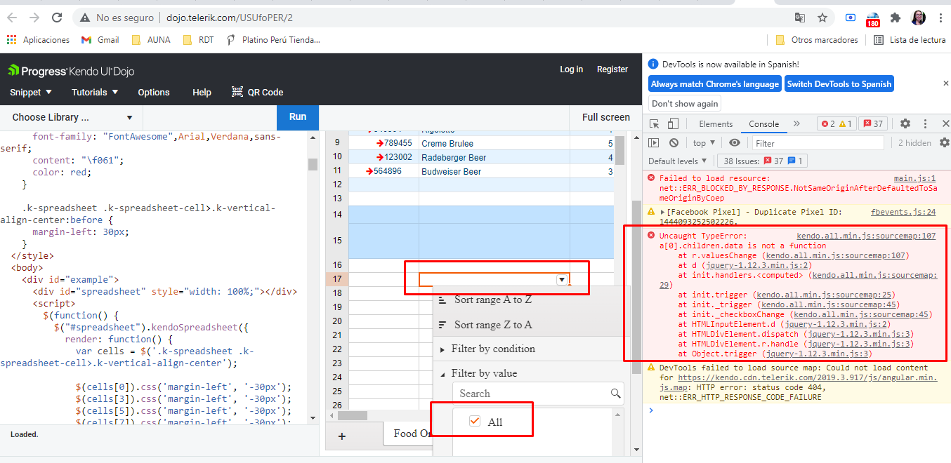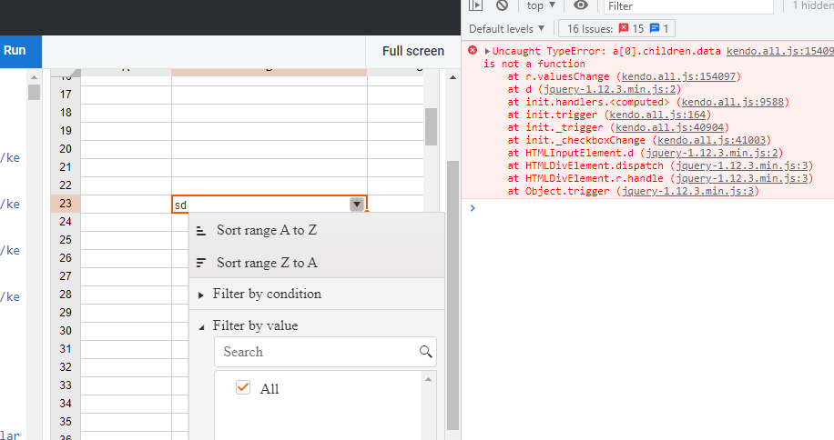 Could you please provide more details about the steps that need to be followed in order to replicate the described issue? I tried to reproduce the issue in the Dojo from the provided image but to no avail. When I try to filter by applying a filter on empty cells, no error is thrown on my side.