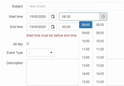 I have accessed the start date time picker from the advanced form of my scheduler and have implemented custom time values as below.