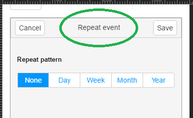 adaptive screen, click on "none" for repeat on main editor in order to actually set recurrence. the window title at top.