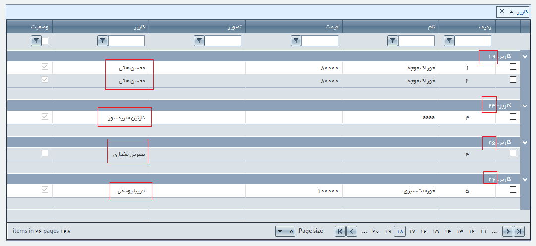 01.<telerik:RadGrid ID="RadGrid1" runat="server" ShowFooter="true" AllowFilteringByColumn="true" GroupingEnabled="true" ShowGroupPanel="True"02. ClientSettings-AllowDragToGroup="true" AllowSorting="true" AllowPaging="true" PageSize="5" Skin="WebBlue" AllowMultiRowSelection="false" CellSpacing="-1" GridLines="Both"03. OnSelectedIndexChanged="RadGrid1_SelectedIndexChanged" OnPageIndexChanged="RadGrid1_PageIndexChanged" OnItemDataBound="RadGrid1_ItemDataBound">04. <ClientSettings EnablePostBackOnRowClick="true">05. <Selecting AllowRowSelect="True" />06. <ClientEvents OnRowCreated="onRowCreated" OnRowSelected="onRowSelected" OnRowDeselected="onRowDeselected"07. OnGridCreated="gridCreated" OnGridCreating="masterTableCreating" />08. </ClientSettings>09. <GroupingSettings ShowUnGroupButton="true" GroupContinuesFormatString="" />10. <MasterTableView ShowGroupFooter="true" AutoGenerateColumns="False" DataKeyNames="Food_User_ID" ClientDataKeyNames="Food_ID_"11. NoMasterRecordsText="اطلاعاتی برای نمایش وجود ندارد">12. <Columns>13. <telerik:GridClientSelectColumn UniqueName="SelectColumn" Visible="true" />14. <telerik:GridTemplateColumn HeaderText="ردیف" ItemStyle-HorizontalAlign="Center" HeaderStyle-Width="100px" Groupable="false">15. <ItemTemplate><%# (Container.ItemIndex+1).ToString() %> </ItemTemplate>16. </telerik:GridTemplateColumn>17. <telerik:GridBoundColumn DataField="Food_ID_" Groupable="false" DataType="System.Int32" FilterControlAltText="Filter Food_ID_ column"18. HeaderText="" ReadOnly="True" SortExpression="Food_ID_" UniqueName="Food_ID_" Visible="false" />19. <telerik:GridBoundColumn DataField="Food_Name" Groupable="true" FilterControlAltText="Filter Food_Name column"20. HeaderText="نام" SortExpression="Food_Name" UniqueName="Food_Name" />21. <telerik:GridBoundColumn DataField="Food_Price" Groupable="true" FilterControlAltText="Filter Food_Price column"22. HeaderText="قیمت" SortExpression="Food_Price" UniqueName="Food_Price" DataType="System.Int32" />23. <telerik:GridBoundColumn DataField="Food_Image" Groupable="false" FilterControlAltText="Filter Food_Image column"24. HeaderText="تصویر" SortExpression="Food_Image" UniqueName="Food_Image" />25. <telerik:GridBoundColumn DataField="Food_User_ID" Groupable="false" SortExpression="Food_User_ID"26. HeaderText="" UniqueName="User_ID" DataType="System.Int32" Visible="false" />27. <telerik:GridBoundColumn DataField="Food_User_ID" Groupable="true" FilterControlAltText="Filter Food_User_ID column"28. HeaderText="کاربر" SortExpression="Food_User_ID" UniqueName="UserFLName" DataType="System.Int32" />29. <telerik:GridCheckBoxColumn DataField="Food_Status" Groupable="false" DataType="System.Boolean" FilterControlAltText="Filter Food_Status column"30. HeaderText="وضعیت" SortExpression="Food_Status" UniqueName="Food_Status" />31. </Columns>32. </MasterTableView>33. <FilterMenu></FilterMenu>34. <HeaderContextMenu RenderMode="Classic"></HeaderContextMenu>35. </telerik:RadGrid>