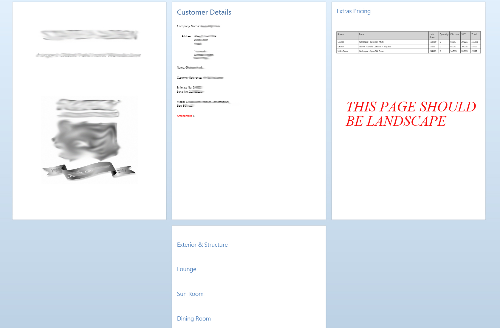 I've attached an image of what my document looks like after all templates have been merged. Note in the image that the page titled "Extras Pricing" should be Landscape. The template this page is drawn from is landscape, but it's importing as portrait.