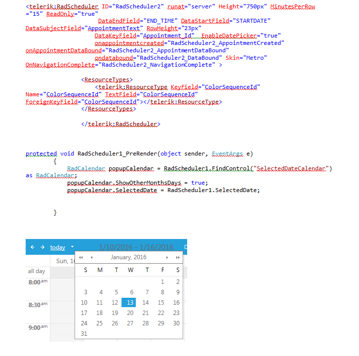 Thank you for helping me to sync my two radschedulers. I do have one other issue that I am not able to figure out. In my Radscheduler I have the dropdown arrow for the popup calendar. When you select a date from the calendar I want it to change the Radscheduler to that date. It is not working for me. Can you please give me some advice on how to make it work? I have attached a document that includes my code and an image of the dropdown calendar.