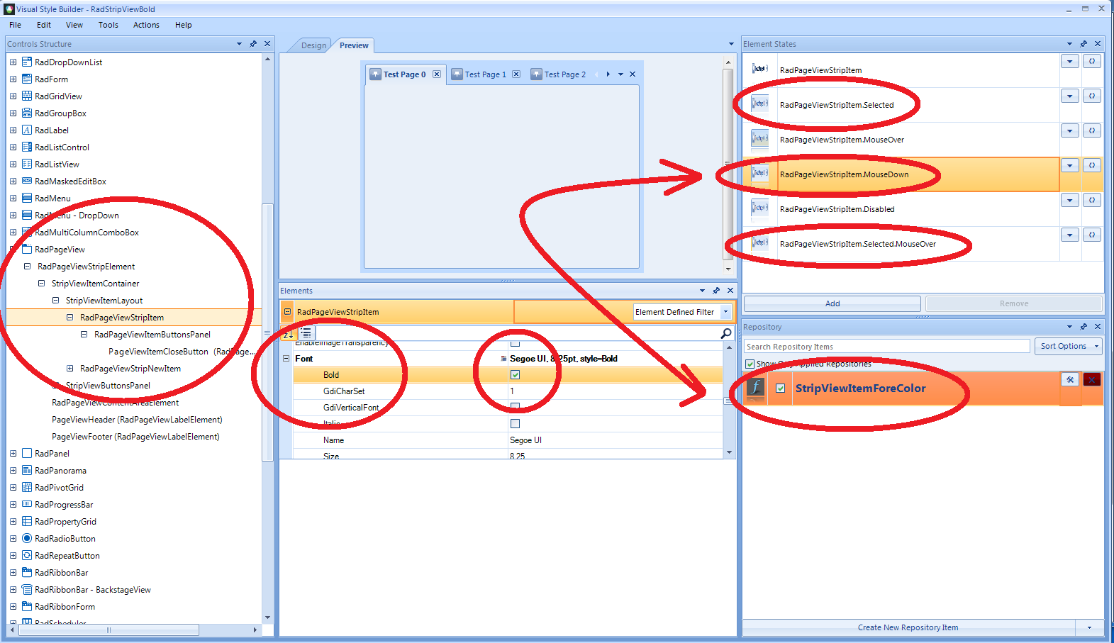 Regarding the style builder approach, there you will have to do the following. On RadPageViewStripItem.Selcted, RadPageViewStripItem.MouseDown (optional), RadPageViewStripItem.MouseOver select the font style to bold. If you decide to style the RadPageViewStripItem.MouseDown state you will have to select the StripViewItemForeColor option from the Repository window. Make sure you reset all other to regular.