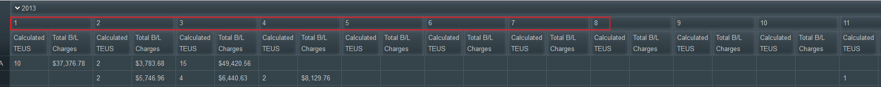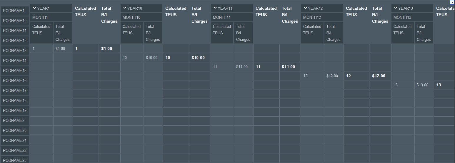 <telerik:RadPivotGrid ID="RadPivotGrid1" runat="server" Skin="Glow" OnNeedDataSource="RadPivotGrid1_OnNeedDataSource" AllowFiltering="False" RowTableLayout="Tabular" AggregatesPosition="Columns" ShowColumnHeaderZone="False" ShowDataHeaderZone="False" ShowRowHeaderZone="False" AllowPaging="True" PageSize="50" ShowFilterHeaderZone="false" AggregatesLevel="2" TotalsSettings-ColumnGrandTotalsPosition="None" TotalsSettings-RowGrandTotalsPosition="Last" > <PagerStyle ChangePageSizeButtonToolTip="Change Page Size" PageSizeControlType="RadComboBox"></PagerStyle> <Fields> <telerik:PivotGridColumnField DataField="Year" UniqueName="Year" Caption="Year"> </telerik:PivotGridColumnField> <telerik:PivotGridColumnField DataField="Month" UniqueName="Month" Caption="Month"> </telerik:PivotGridColumnField> <telerik:PivotGridRowField DataField="DestinationName" UniqueName="DestinationName" Caption="Destination"> </telerik:PivotGridRowField> <telerik:PivotGridAggregateField DataFormatString="{0:N0}" DataField="Teus" UniqueName="Teus" Caption="Teus"> <TotalFormat Axis="Rows" Level="0" SortOrder="Ascending" TotalFunction="NoCalculation" /> <HeaderCellTemplate> <asp:Label ID="lblAggregateCellTEUS" Text="Calculated TEUS" runat="server" /> </HeaderCellTemplate> </telerik:PivotGridAggregateField> <telerik:PivotGridAggregateField DataFormatString="{0:C}" DataField="TotalCharge" UniqueName="TotalCharge" Caption="TotalCharge"> <TotalFormat Axis="Rows" Level="0" SortOrder="Ascending" TotalFunction="NoCalculation" /> <HeaderCellTemplate> <asp:Label ID="lblAggregateCellTotalCharge" Text="Total Charges" runat="server" /> </HeaderCellTemplate> </telerik:PivotGridAggregateField> </Fields> </telerik:RadPivotGrid>Code behind: