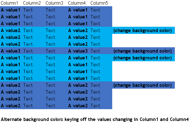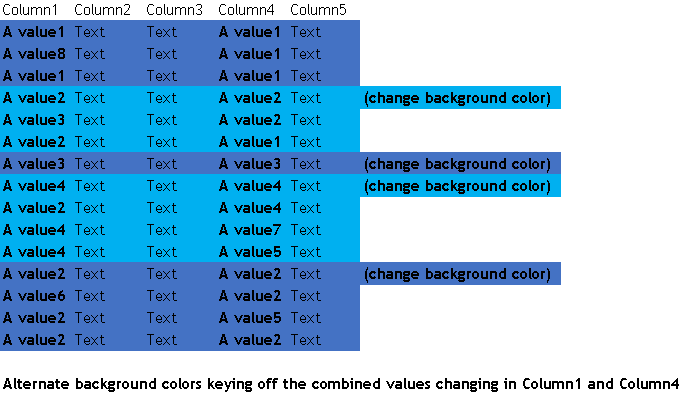 We have a requirement to change the background color of a row based on changing values from a group of data, much like the alternating row color. However, instead of alternating row color based on every other row or every N row or based on some bound value, we need to alternate row background colors when values of 2 or more column values have changed.