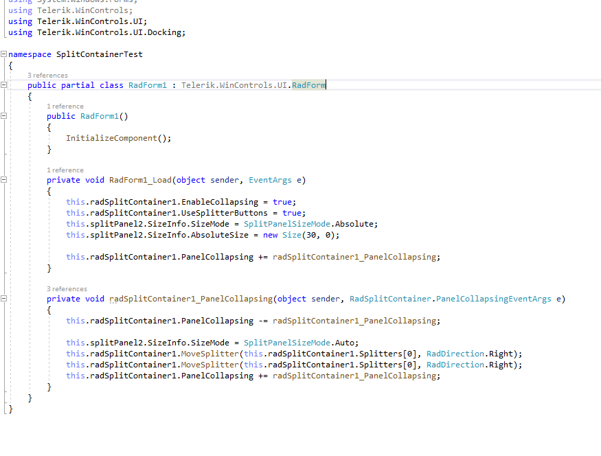 public partial class Form1 : Form{ public Form1() { InitializeComponent(); this.radSplitContainer1.EnableCollapsing = true; this.radSplitContainer1.UseSplitterButtons = true; this.Load += Form1_Load; this.radSplitContainer1.PanelCollapsing += radSplitContainer1_PanelCollapsing; } private void Form1_Load(object sender, EventArgs e) { SplitterElement splitter = this.radSplitContainer1.Splitters.First(); splitter.NextNavigationButton.PropertyChanged += NextNavigationButton_PropertyChanged; splitter.NextNavigationButton.Visibility = ElementVisibility.Visible; splitter.PrevNavigationButton.PropertyChanged += NextNavigationButton_PropertyChanged; splitter.PrevNavigationButton.Visibility = ElementVisibility.Collapsed; } private void NextNavigationButton_PropertyChanged(object sender, PropertyChangedEventArgs e) { RadButtonElement btn = sender as RadButtonElement; if (e.PropertyName == "Visibility" && btn.Class == "NextUpSplitterThumb") { if (btn.Visibility == ElementVisibility.Collapsed) { btn.Visibility = ElementVisibility.Visible; btn.AngleTransform = 0f; } } if (e.PropertyName == "Visibility" && btn.Visibility == ElementVisibility.Visible && btn.Class == "PrevDownSplitterThumb") { btn.Visibility = ElementVisibility.Collapsed; } } void radSplitContainer1_PanelCollapsing(object sender, RadSplitContainer.PanelCollapsingEventArgs e) { SplitterElement splitter = this.radSplitContainer1.Splitters.First(); splitter.NextNavigationButton.AngleTransform = 180f; }}I am also sending you gif file with the result on my end.