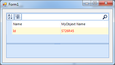 public Form1(){ InitializeComponent(); this.radPropertyGrid1.SelectedObject = new MyObject("S726R45", "MyObjext Name"); this.radPropertyGrid1.ToolbarVisible = true;}private void radPropertyGrid1_ItemFormatting(object sender, PropertyGridItemFormattingEventArgs e){ PropertyGridItem item = e.Item as PropertyGridItem; if (item != null) { if (item.ReadOnly) { e.VisualElement.ForeColor = Color.Red; } else { e.VisualElement.ResetValue(LightVisualElement.ForeColorProperty, Telerik.WinControls.ValueResetFlags.Local); } }}public class MyObject{ private string id; private string name; public MyObject(string id, string name) { this.id = id; this.name = name; } public string Name { get { return this.name; } set { this.name = value; } } public string Id { get { return this.id; } }}I hope this information helps. Should you have further questions, I would be glad to help.
