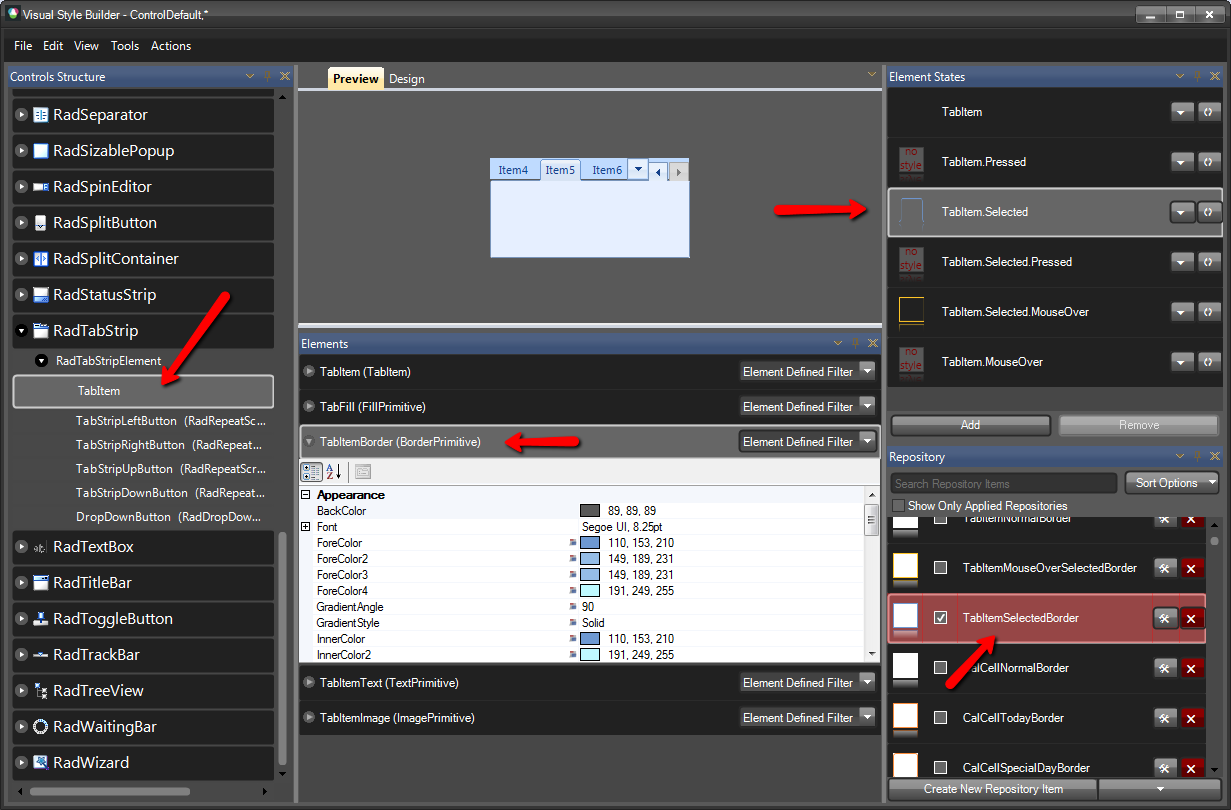 This could be done using Visual Style Builder. It is a tool for creating themes for RadControls for WinForms by creating property settings for different visual states of an element. More information about using Visual Style Builder can be found on this help article. I have attached a screenshot which shows how to select and edit the border in the selected state of the tab strip item.