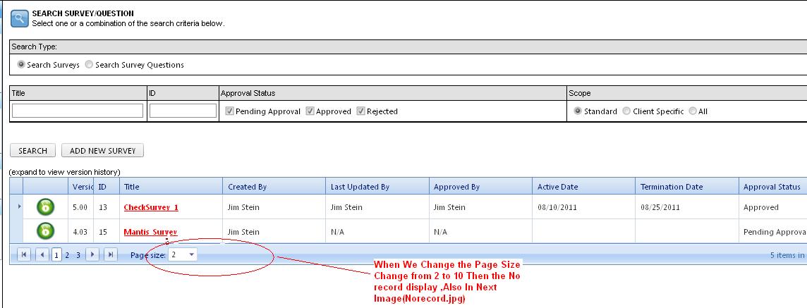 AllowCustomPaging="True" AllowAutomaticInserts="false" AllowAutomaticUpdates="false" AllowAutomaticDeletes="true" OnItemCommand="rgSurvey_ItemCommand" OnSortCommand="rgSurvey_SortCommand" OnNeedDataSource="rgSurvey_NeedDataSource" runat="server" Skin="Office2007" PageSize="20" ShowGroupPanel="false" ClientSettings-AllowDragToGroup="true" ClientSettings-AlowExpandCollapse="true" OnDetailTableDataBind="rgSurvey_DetailTableDataBind" DataMember="SurveyTemplateID" OnItemDataBound="rgSurvey_ItemDataBound" OnPreRender="rgSurvey_PreRender"> <PagerStyle Mode="NextPrevAndNumeric" /> <MasterTableView TableLayout="Fixed" DataKeyNames="SurveyTemplateID" HierarchyDefaultExpanded="false" CommandItemDisplay="None" CommandItemSettings-AddNewRecordText="Add New User" HierarchyLoadMode="Client"> <DetailTables> <telerik:GridTableView AllowPaging="false" AllowSorting="false" > <Columns> <telerik:GridTemplateColumn UniqueName="LockUnlock" HeaderText="" HeaderStyle-Width="70" ItemStyle-HorizontalAlign="Center" ItemStyle-Width="70"> <itemtemplate> <asp:ImageButton ID="Image1" runat="server" OnClientClick="return checkuserlock(this);" CommandName="UnlockSurvey" /> <br /> <asp:Label ID="lblLockUserName" runat="server" Text='<%# Eval("LockUserName") %>' /> <asp:Label ID="lblInnerLockUserId" runat="server" Text='<%# Eval("LockUserID") %>' style="display:none;"></asp:Label> </itemtemplate> </telerik:GridTemplateColumn> <telerik:GridBoundColumn HeaderText="Version" DataField="SurveyVersion" HeaderStyle-Width="40"> </telerik:GridBoundColumn> <telerik:GridBoundColumn HeaderText="ID" DataField="SurveyTemplateID" UniqueName="SurveyTemplateID" SortExpression="SurveyTemplateID" HeaderStyle-Width="40" /> <telerik:GridButtonColumn HeaderText="Title" DataTextField="SurveyName" UniqueName="SurveyName" ItemStyle-Font-Bold="false" SortExpression="SurveyName" CommandName="editcontent" /> <telerik:GridBoundColumn HeaderText="Created By" DataField="UserNAME"> </telerik:GridBoundColumn> <telerik:GridBoundColumn HeaderText="Last Updated By" DataField="LastUpdatedUser"> </telerik:GridBoundColumn> <telerik:GridBoundColumn HeaderText="Approved By" DataField="ApprovedBy"> </telerik:GridBoundColumn> <telerik:GridBoundColumn HeaderText="Active Date" DataField="ActiveDate"> </telerik:GridBoundColumn> <telerik:GridBoundColumn HeaderText="Termination Date" DataField="TerminationDate"> </telerik:GridBoundColumn> <telerik:GridBoundColumn HeaderText="Approval Status" DataField="ApprovalStatus"> </telerik:GridBoundColumn> <telerik:GridBoundColumn HeaderText="" DataField="LockUserID" Visible="false"> </telerik:GridBoundColumn> </Columns> </telerik:GridTableView> </DetailTables> <Columns> <telerik:GridTemplateColumn UniqueName="LockUnlock" HeaderText="" HeaderStyle-Width="70" ItemStyle-HorizontalAlign="Center" ItemStyle-Width="70"> <ItemTemplate> <asp:ImageButton ID="Image1" runat="server" OnClientClick="return checkuserlock(this);" CommandName="UnlockSurvey"/><br /> <asp:Label ID="lblLockUserName" runat="server" Text='<%# Eval("LockUserName") %>' /> <asp:Label ID="lblLockUserId" runat="server" Text='<%# Eval("LockUserID") %>' style="display:none;"></asp:Label> </ItemTemplate> </telerik:GridTemplateColumn> <telerik:GridBoundColumn HeaderText="Version" DataField="SurveyVersion" HeaderStyle-Width="40"> </telerik:GridBoundColumn> <telerik:GridBoundColumn HeaderText="ID" DataField="SurveyTemplateID" UniqueName="SurveyTemplateID" SortExpression="SurveyTemplateID" HeaderStyle-Width="40" /> <telerik:GridButtonColumn HeaderText="Title" DataTextField="SurveyName" UniqueName="SurveyName" ItemStyle-Font-Bold="true" ItemStyle-ForeColor="Red" SortExpression="SurveyName" CommandName="editcontent" /> <telerik:GridBoundColumn HeaderText="Created By" DataField="UserNAME" SortExpression="UserNAME"> </telerik:GridBoundColumn> <telerik:GridBoundColumn HeaderText="Last Updated By" DataField="LastUpdatedUser" SortExpression="LastUpdatedUser"> </telerik:GridBoundColumn> <telerik:GridBoundColumn HeaderText="Approved By" DataField="ApprovedBy" SortExpression="ApprovedBy"> </telerik:GridBoundColumn> <telerik:GridBoundColumn HeaderText="Active Date" DataField="ActiveDate" SortExpression="ActiveDate"> </telerik:GridBoundColumn> <telerik:GridBoundColumn HeaderText="Termination Date" DataField="TerminationDate" SortExpression="TerminationDate"> </telerik:GridBoundColumn> <telerik:GridBoundColumn HeaderText="Approval Status" DataField="ApprovalStatus" SortExpression="ApprovalStatus"> </telerik:GridBoundColumn> <telerik:GridBoundColumn HeaderText="" DataField="LockUserID" Visible="false"> </telerik:GridBoundColumn> </Columns> </MasterTableView> </telerik:RadGrid> protected override void OnLoad(EventArgs e) { base.OnLoad(e); if (!Page.IsPostBack) { this.rgSurvey.PageSize = 2; } } protected void rgSurvey_NeedDataSource(object source, Telerik.Web.UI.GridNeedDataSourceEventArgs e) { if (!e.IsFromDetailTable) { SetSurveyContentGridDataSource(); } } private void SetSurveyContentGridDataSource() { int totalRecord = 0; this.rgSurvey.DataSource = GetSearchBySurvey(ref totalRecord); this.rgSurvey.VirtualItemCount = totalRecord; } private List<GetSearchSurveyResult_Result> GetSearchBySurvey(ref int totalRecord) { string approvalstatus = string.Empty; SurveyQuestionBL oSurveyCategory = new SurveyQuestionBL(); int pageSize = this.rgSurvey.PageSize; string sortExpression = GetSortedColumnName("SURVEY"); string sortDirection = GetSortedDirection("SURVEY"); foreach (ListItem li in cbApprovalStatus.Items) { if (li.Selected == true) { approvalstatus += li.Value + ","; } } GetSearchSurveyResult_Result obj = new GetSearchSurveyResult_Result { SurveyTemplateID = txtSurveyID.Text.Length > 0 ? Convert.ToInt32(txtSurveyID.Text) : 0, SurveyName = txtSurveyTitle.Text, SurveyScopeID = Convert.ToInt32(rblScope.SelectedValue), ApprovalStatusID = approvalstatus, ClientID = Convert.ToInt32(rblScope.SelectedValue) ==(int) Scope.ClientSpecific ? (int?)Convert.ToInt32(ddlClientList.SelectedValue) : null }; //int 