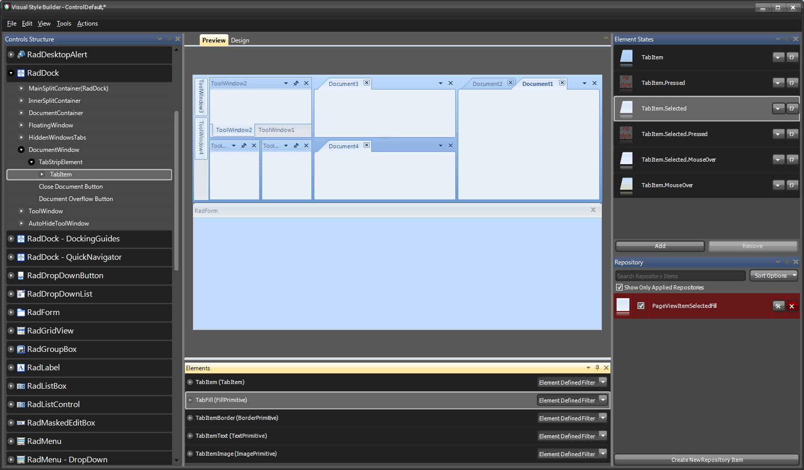 From what I understand, you want to change the color of the selected tab in a tabbed document. If this is so, then you should change it through the Visual Style Builder. General help for the Visual Style Builder and themes can be found here. I have attached a screenshot showing how you can select the tab item in the Visual Style Builder.