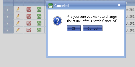 Attached is an image of the datagrid after initial loading. You will notice that all icons display correctly the first time and that the tooltip is correct on the first datarow. The other image displays the confirm box using the RadWindow with the correct dynamically generated message for the first datarow.