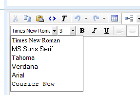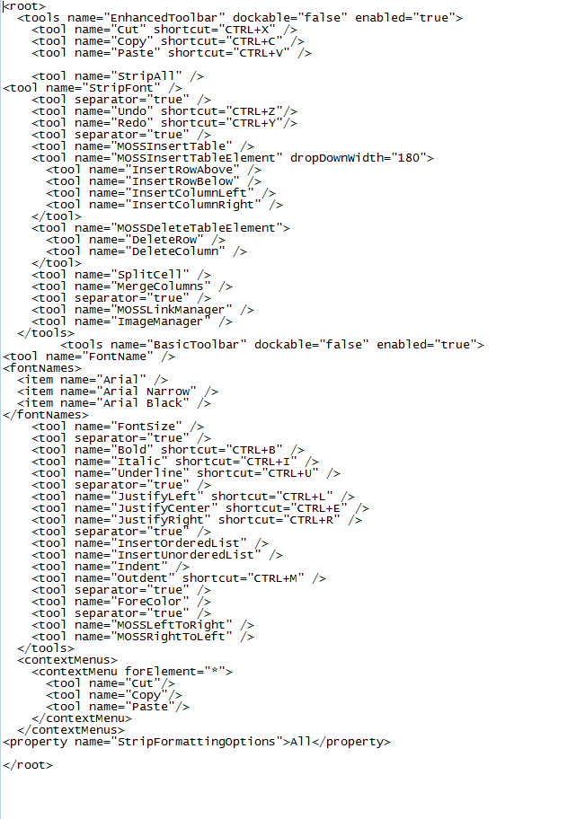 <root> <tools name="EnhancedToolbar" dockable="false" enabled="true"> <tool name="Cut" shortcut="CTRL+X" /> <tool name="Copy" shortcut="CTRL+C" /> <tool name="Paste" shortcut="CTRL+V" /> <tool name="FormatStripper" /> <tool separator="true" /> <tool name="Undo" shortcut="CTRL+Z"/> <tool name="Redo" shortcut="CTRL+Y"/> <tool separator="true" /> <tool name="MOSSInsertTable" /> <tool name="MOSSInsertTableElement" dropDownWidth="180"> <tool name="InsertRowAbove" /> <tool name="InsertRowBelow" /> <tool name="InsertColumnLeft" /> <tool name="InsertColumnRight" /> </tool> <tool name="MOSSDeleteTableElement"> <tool name="DeleteRow" /> <tool name="DeleteColumn" /> </tool> <tool name="SplitCell" /> <tool name="MergeColumns" /> <tool separator="true" /> <tool name="MOSSLinkManager" /> <tool name="ImageManager" /> </tools> <tools name="BasicToolbar" dockable="false" enabled="true"> <tool name="FontName" /> <tool name="FontSize" /> <tool separator="true" /> <tool name="Bold" shortcut="CTRL+B" /> <tool name="Italic" shortcut="CTRL+I" /> <tool name="Underline" shortcut="CTRL+U" /> <tool separator="true" /> <tool name="JustifyLeft" shortcut="CTRL+L" /> <tool name="JustifyCenter" shortcut="CTRL+E" /> <tool name="JustifyRight" shortcut="CTRL+R" /> <tool separator="true" /> <tool name="InsertOrderedList" /> <tool name="InsertUnorderedList" /> <tool name="Indent" /> <tool name="Outdent" shortcut="CTRL+M" /> <tool separator="true" /> <tool name="ForeColor" /> <tool separator="true" /> <tool name="MOSSLeftToRight" /> <tool name="MOSSRightToLeft" /> </tools> <contextMenus> <contextMenu forElement="*"> <tool name="Cut"/> <tool name="Copy"/> <tool name="Paste"/> </contextMenu> </contextMenus> <fontNames> <item name="Arial" /> <item name="Arial Narrow" /> <item name="Arial Black" /> </fontNames></root>Best regards,