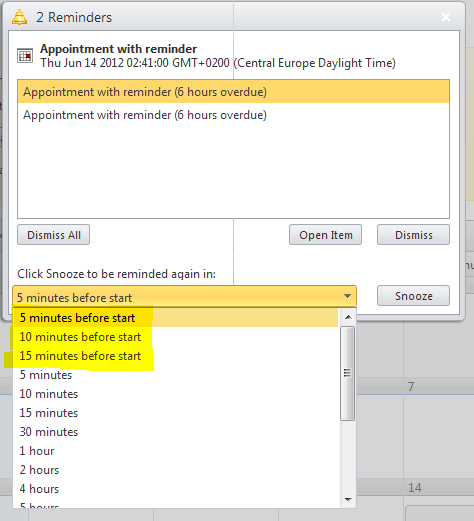 function OnClientReminderTriggering(sender, args) { var combo = $find(sender.get_id() + "_ReminderDialog_SnoozeTime"); for (var i = 0; i < 3; i++) { combo.get_items().removeAt(0); } var firstItem = combo.get_items().getItem(0); if (firstItem) { firstItem.select(); } }Regards,