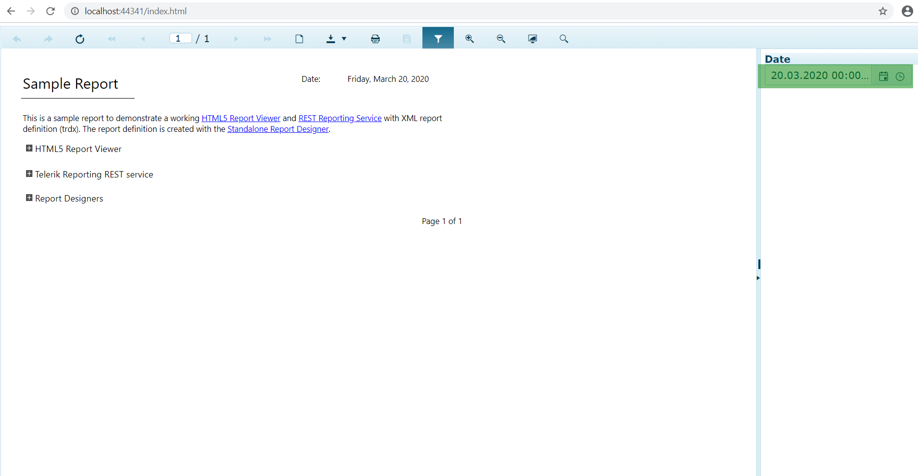 <script type="text/javascript"> $(document).ready(function () { $("#reportViewer1") .telerik_ReportViewer({ reportServer: "~/", parameterEditors: [ { match: function (parameter) { return parameter.type === "System.DateTime"; }, createEditor: function (placeholder, options) { $(placeholder).html('<input type="datetime"/>'); var dateTimePicker = $(placeholder), parameter, valueChangedCallback = options.parameterChanged, dropDownList; function onChange() { var dtv = this.value(); if (null !== dtv) { dtv = myadjustTimezone(dtv); } valueChangedCallback(parameter, dtv); } return { beginEdit: function (param) { parameter = param; var dt = null; try { if (param.value) { dt = myunadjustTimezone(param.value); } } catch (e) { dt = null; } $(dateTimePicker).find("input").kendoDateTimePicker({ format: "dd.MM.yyyy HH:mm:ss", parseFormats: ["MM.dd.yyyy", "HH:mm:ss"], change: onChange, value: dt }); dropDownList = $(dateTimePicker).find("input").data("kendoDateTimePicker"); } } } }] }); }); function myadjustTimezone(date) { return new Date(Date.UTC(date.getFullYear(), date.getMonth(), date.getDate(), date.getHours(), date.getMinutes(), date.getSeconds(), date.getMilliseconds())); }; function myunadjustTimezone(date) { return new Date(date.getUTCFullYear(), date.getUTCMonth(), date.getUTCDate(), date.getUTCHours(), date.getUTCMinutes(), date.getUTCSeconds(), date.getUTCMilliseconds()); };</script>