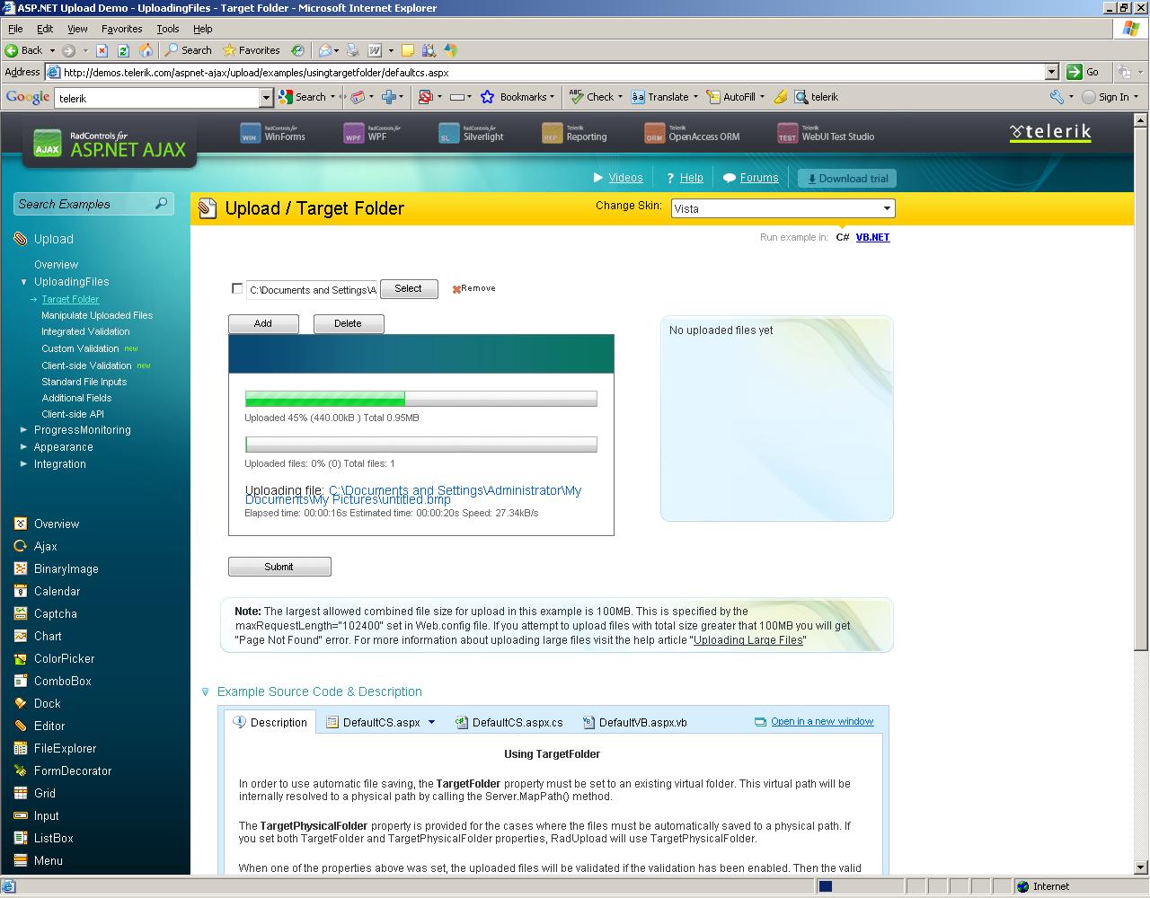 <script type="text/javascript"> function pageLoad() { if ($telerik.isIE) { var area = $find("RadProgressArea1"); var currentFile = $telerik.$(".ruCurrentFile span", area.get_element())[0]; var fileName = currentFile.innerHTML; var index = fileName.lastIndexOf("\\"); if (index != -1) { var result = fileName.substring(index + 1); currentFile.innerHTML = result; } } } </script>Sincerely yours,