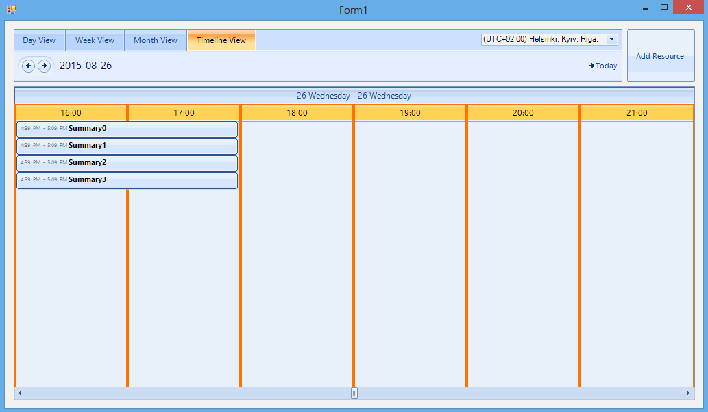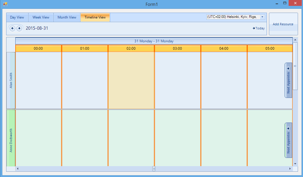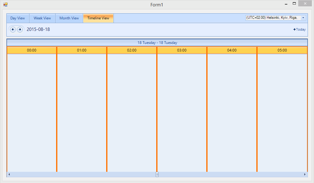public partial class Form1 : Form{ public Form1() { InitializeComponent(); this.Load += Form1_Load; } private void Form1_Load(object sender, EventArgs e) { this.radScheduler1.ActiveViewType = Telerik.WinControls.UI.SchedulerViewType.Timeline; SchedulerTimelineView schedulerTimelineView = this.radScheduler1.GetTimelineView(); schedulerTimelineView.ShowTimescale(Timescales.Hours); SchedulerTimelineViewElement viewElement = (SchedulerTimelineViewElement)this.radScheduler1.ViewElement; viewElement.NavigationElement.SmallChange = 4; viewElement.NavigationElement.LargeChange = 4; viewElement.NavigationElement.RadPropertyChanging += NavigationElement_RadPropertyChanging; } private void NavigationElement_RadPropertyChanging(object sender, Telerik.WinControls.RadPropertyChangingEventArgs args) { if (args.Property.Name == "SmallChange" || args.Property.Name == "LargeChange") { if ((int)args.NewValue < (int)args.OldValue) { args.Cancel = true; } } }}Additional information on working with the timeline view, you can find in the following documentation article: Timeline View.