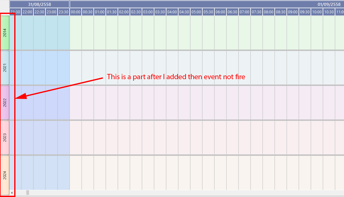 // Add resource to collection.int iColIdx = 0;SchedulerResourceCollection srcInst = new SchedulerResourceCollection();radSchdView.Resources.BeginUpdate();for(int iIdx=0; iIdx < 20; iIdx++){ Resource resource = new Resource("1234", "3333"); resource.Color = G.BG_COL[iColIdx]; srcInst.Add(resource); iColIdx++; if(iColIdx > (G.BG_COL.Length - 1)) iColIdx = 0;}// Set resources to scheduler.SchedulerBindingDataSource sbd = new SchedulerBindingDataSource();ResourceMappingInfo rmi = new ResourceMappingInfo();rmi.Id = "Id";rmi.Name = "Name";rmi.Color = "Color";rmi.Visible = "Visible";sbd.ResourceProvider.Mapping = rmi;sbd.ResourceProvider.DataSource = srcInst;radSchdView.DataSource = sbd;radSchdView.Resources.EndUpdate();radSchdView.GroupType = GroupType.Resource;schTlve.Header.LayoutUpdated += new EventHandler(UpdateSchedulerHeader);schTlve.NavigationElement.SmallChange = 5;schTlve.NavigationElement.LargeChange = 10;schTlve.NavigationElement.RadPropertyChanging += NavigationElement_RadPropertyChanging;Thank you for writing back.