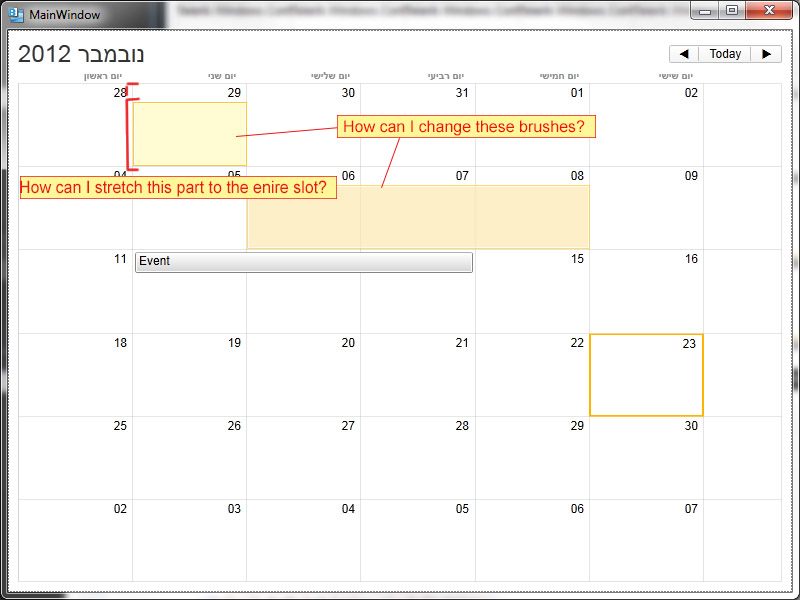 I am working on a month view in the ScheduleView control, and I've been trying to find a way to change the brushes of the slots (ie the TimeRulerMonthViewItem) when they are hovered over or selected.
