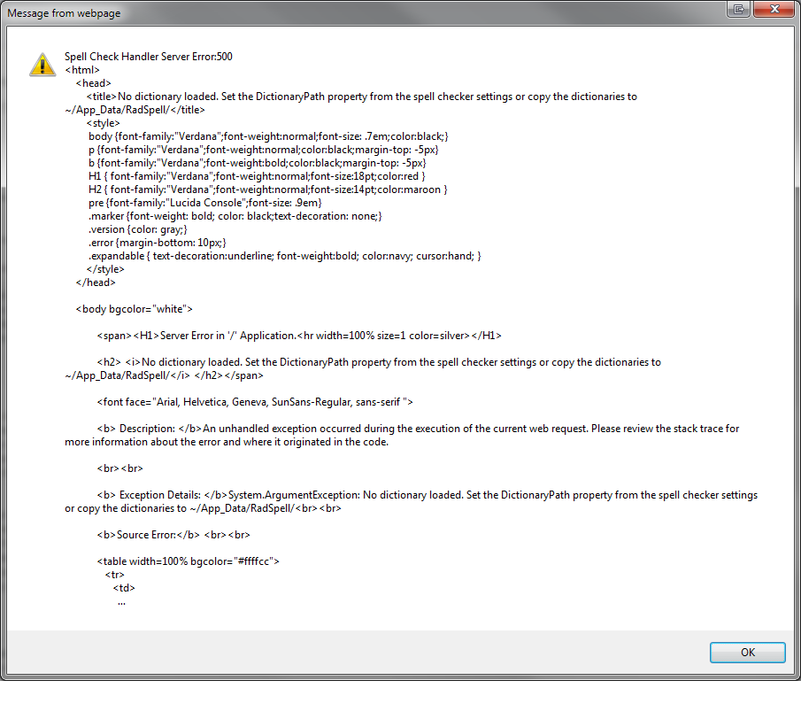 RadEditor1.SpellCheckSettings.DictionaryPath = "/include/RadControls/Spell/TDF"If Threading.Thread.CurrentThread.CurrentCulture.Name.ToLower() = "es-pr" Then RadEditor1.SpellCheckSettings.DictionaryLanguage = "es-ES" RadEditor1.SpellCheckSettings.SpellCheckProvider = Telerik.Web.UI.SpellCheckProvider.EditDistanceProviderElse RadEditor1.SpellCheckSettings.DictionaryLanguage = "es-US" RadEditor1.SpellCheckSettings.SpellCheckProvider = Telerik.Web.UI.SpellCheckProvider.PhoneticProviderEnd IfI have to set those values on the server because we have spanish users, so we need to change the dictionary language and provider for those users. When I click on the spell check button on the RadEditor, i just get a server error 500 - Dictionary Path is not set. I have attached a picture of the error.