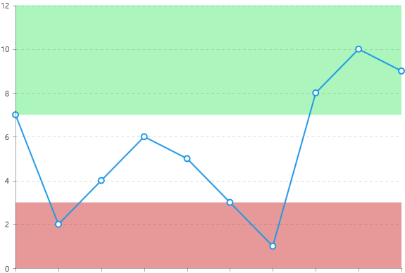 <div id="chart" data-win-control="Telerik.UI.RadChart" data-win-options="{ theme: 'light', series: [{ type: 'line', data: [7, 2, 4, 6, 5, 3, 1, 8, 10, 9] }], valueAxis: { plotBands: [ { from: 0, to: 3, color: 'rgba(194, 0, 0, 0.4)' }, { from: 7, to: 12, color: 'rgba(48, 233, 92, 0.4)' } ] } }" style="width: 600px"></div>For more information, please refer to the Blot Bands section in the RadChart series documentation.